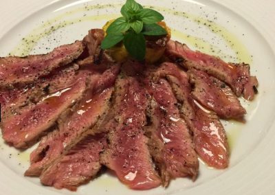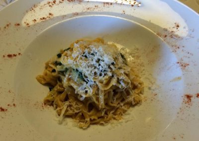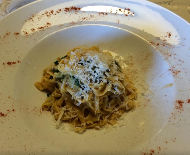 Il pesce è di pescato e sempre freschissimo, i prodotti sono locali dalla carne alle verdure, molte delle quali coltivate nel proprio orto e il pane è del forno di proprietà.
