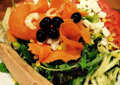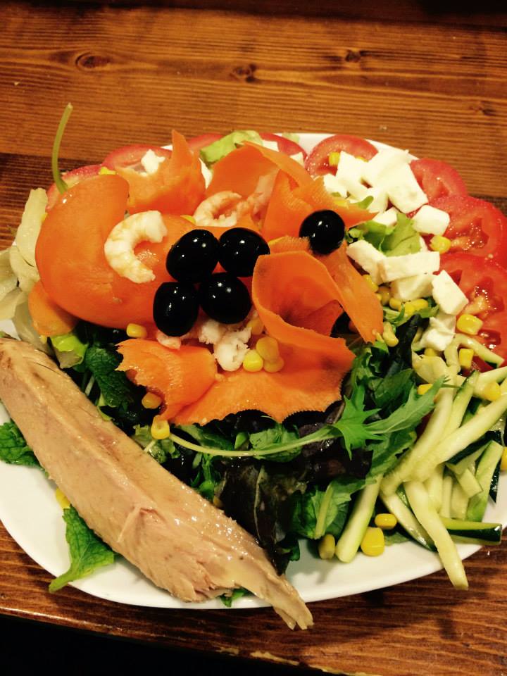 INSALATONE MISTE (pomodori, carote, insalata, mais, olive, melanzane grigliate, zucchine, mozzarella – o tonno, o prosciutto, o bresaola, o uovo sodo)