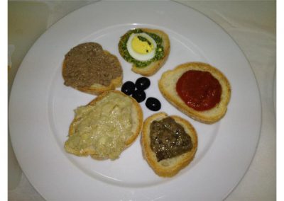 BRUSCHETTE VEGETARIANE – CARPACCIO DI ZUCCHINE, PINOLI E GRANA – PROSCIUTTO E MELONE – CARPACCIO DI FINOCCHIELLE ALL’ARANCIA – INSALATA DI MARE – CARPACCIO DI SALMONE CON VALERIANA E LIME – CARPACCIO DI TONNO CON VERDURE JULIENNE – INSALATINA DI SPINACI FRESCHI, GAMBERETTI E PINOLI
