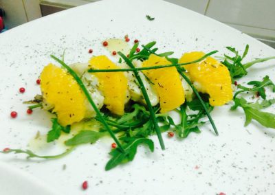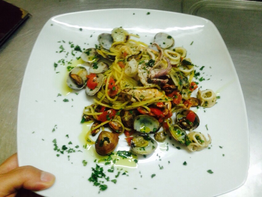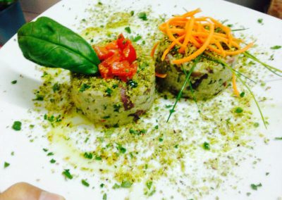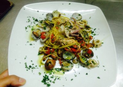 Secondi: Spada alla messinese (pesce spada, olive bnere, pomodoro e basilico), Tagliata di tonno al sesamo, bistecca di ceci con finocchio ed insalata per i palati vegetariani.