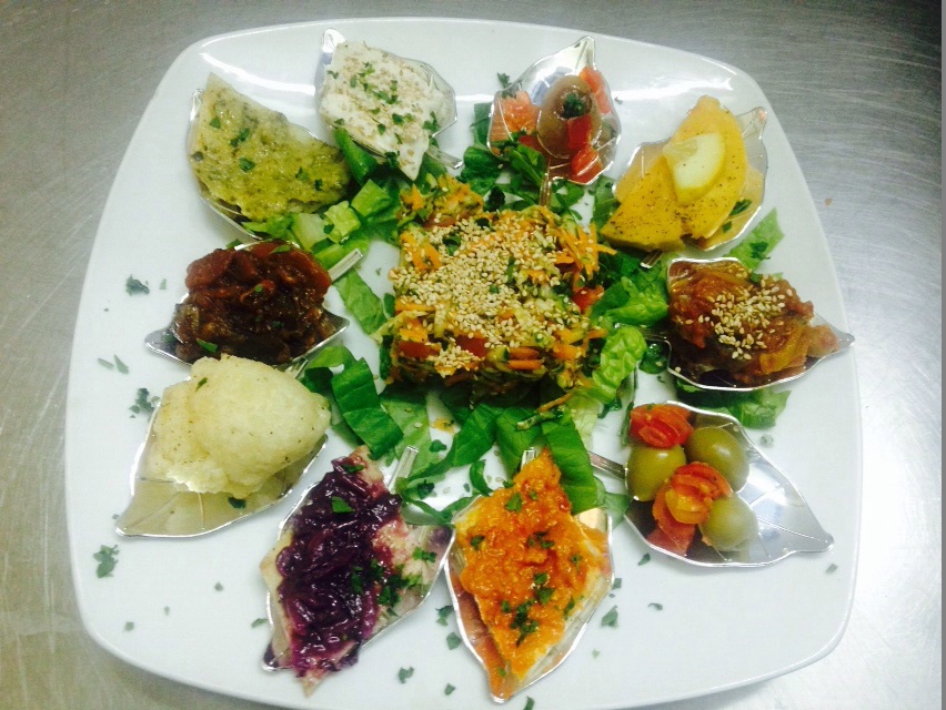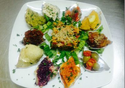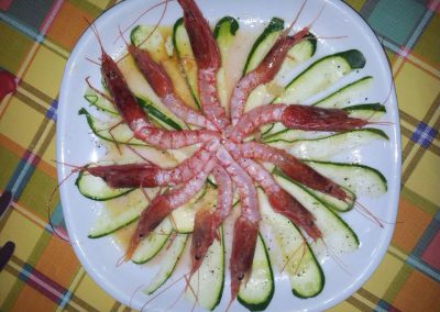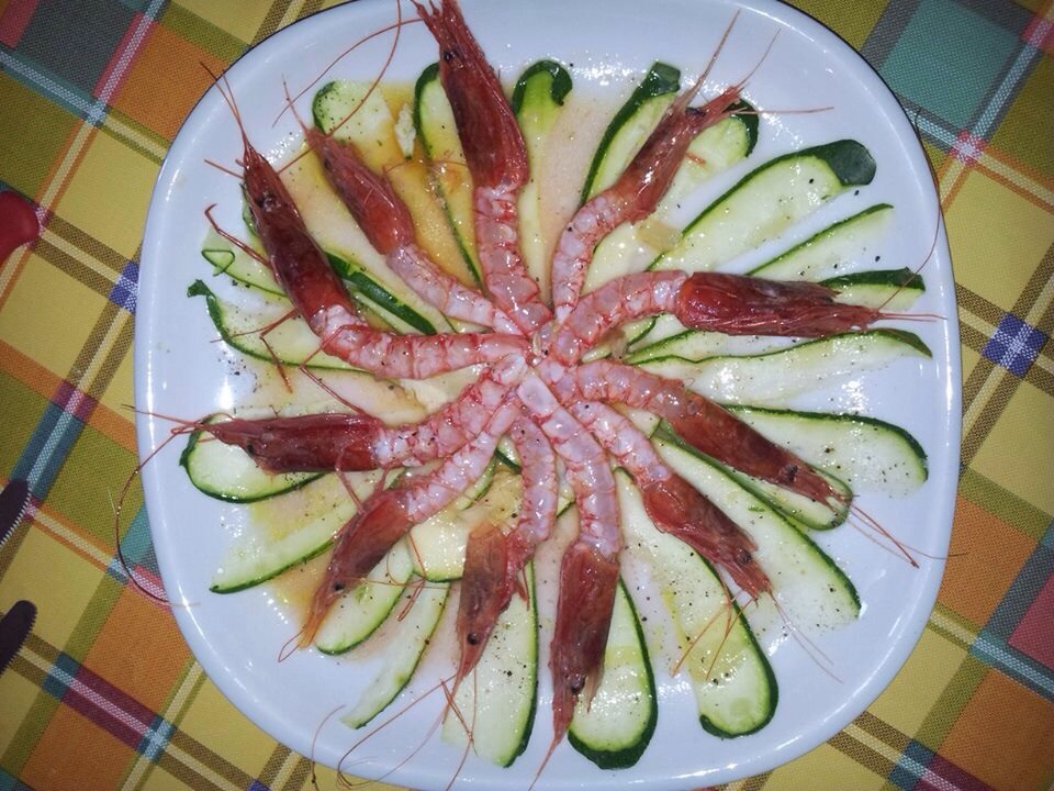 Antipasti: Carpaccio di zucchine, Trito di verdure (cruditè), Gran piatto crudo (Gamberone blu dell’Oceania, tonno e salmone)