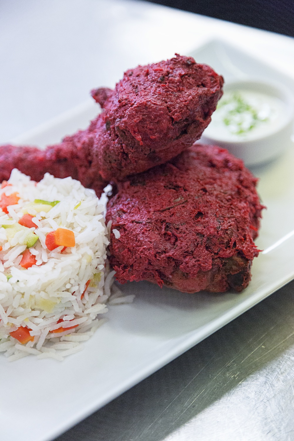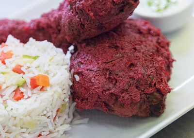 QUINOA BURGER 12 € con polpetta di quinoa e panko, avocado, lattuga, pomodoro, cipolle di tropea e patate fritte