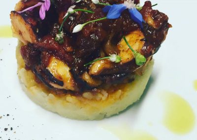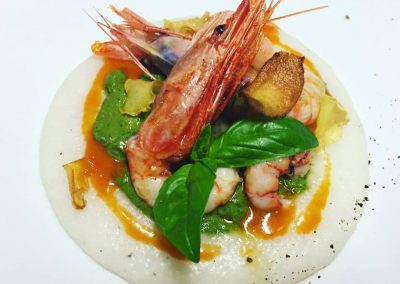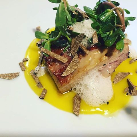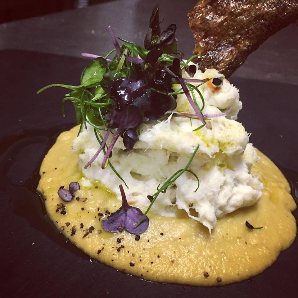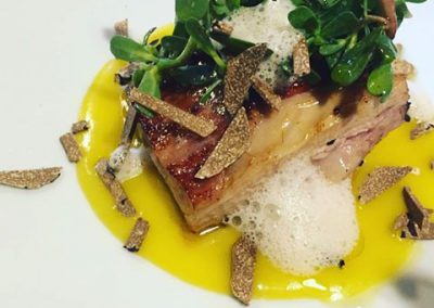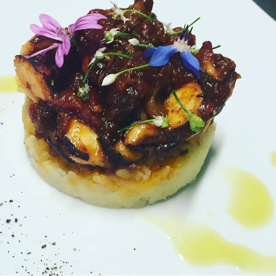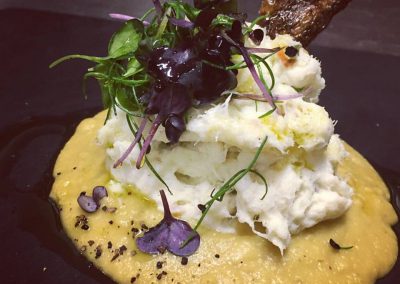 Pancia di vitello con crema di patate, zafferano e insalata di misticanza