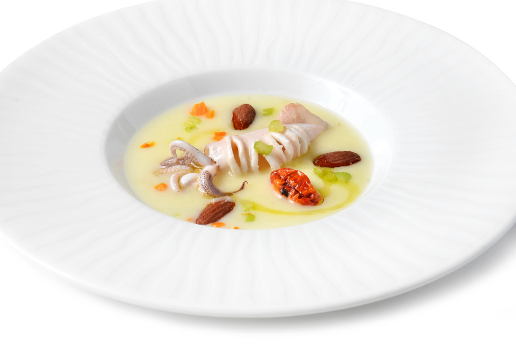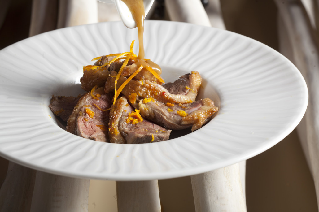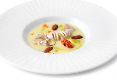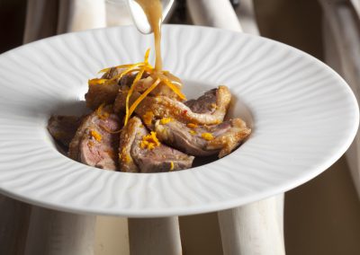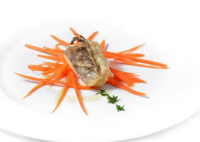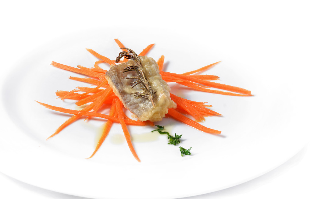 Menù 2 – Ravioli di  trabaccolara   con rucola e pomodorini, filetto con erbe aromatiche cotto a bassa temperatura con quenelle di patate o verdura di stagione;