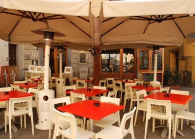 Bruschetta con radicchio brasato e parmigiano a scaglie, bruschetta al pomodoro, verdure grigliate di stagione, mozzarella di bufala, salumi toscani.