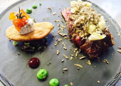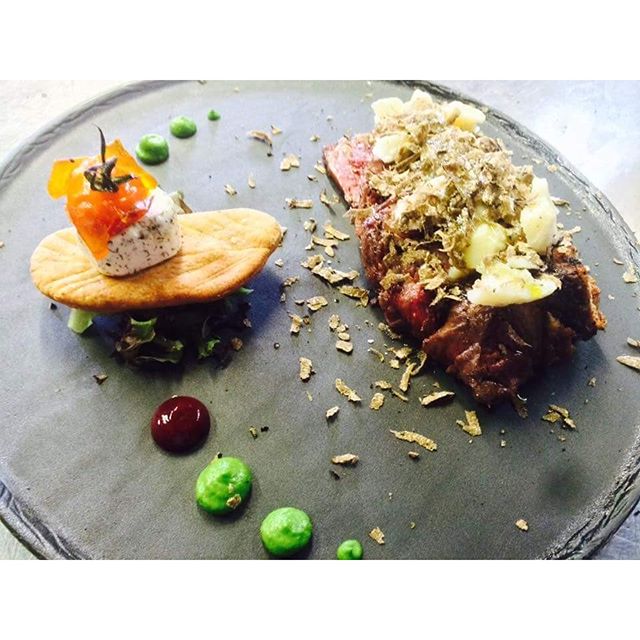 Tagliata con grana, tartufo, burro alle erbe e chips di farine macinate a pietra