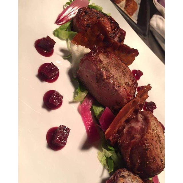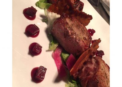Medaglioni di filetto di grigio, barbabietole e cipolle agro