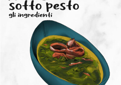 Prendere una terrina e disporre uno strato di pesto; mettere uno strato di filetti di acciughe, l’uno accanto a l’altro, e coprire con uno strato di pesto. Procedere allo stesso modo fino ad esaurimento degli ingredienti. Se necessario utilizzare altro olio per coprire completamente sia il pesto che le acciughe.