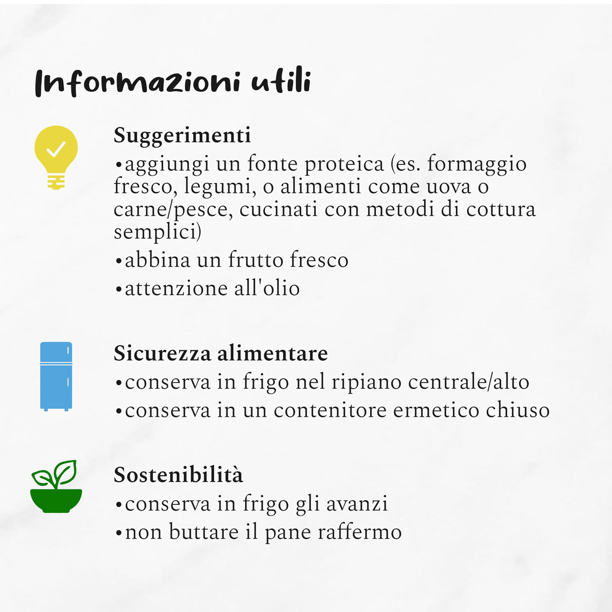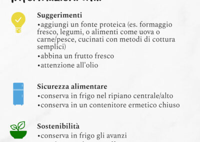 Scegli metodi di cottura semplici ed abbina un frutto fresco di stagione al tuo pasto. Fai attenzione al quantitativo d’olio aggiunto. Sicurezza alimentare: conserva la panzanella in frigorifero all’interno di un contenitore chiuso per preservarla dalle contaminazioni e dalla proliferazione batterica. Riponi in contenitore nel ripiano centrale/alto del frigorifero e ricordati di consumarlo nei giorni immediatamente successivi alla preparazione per evitarne il deperimento.
